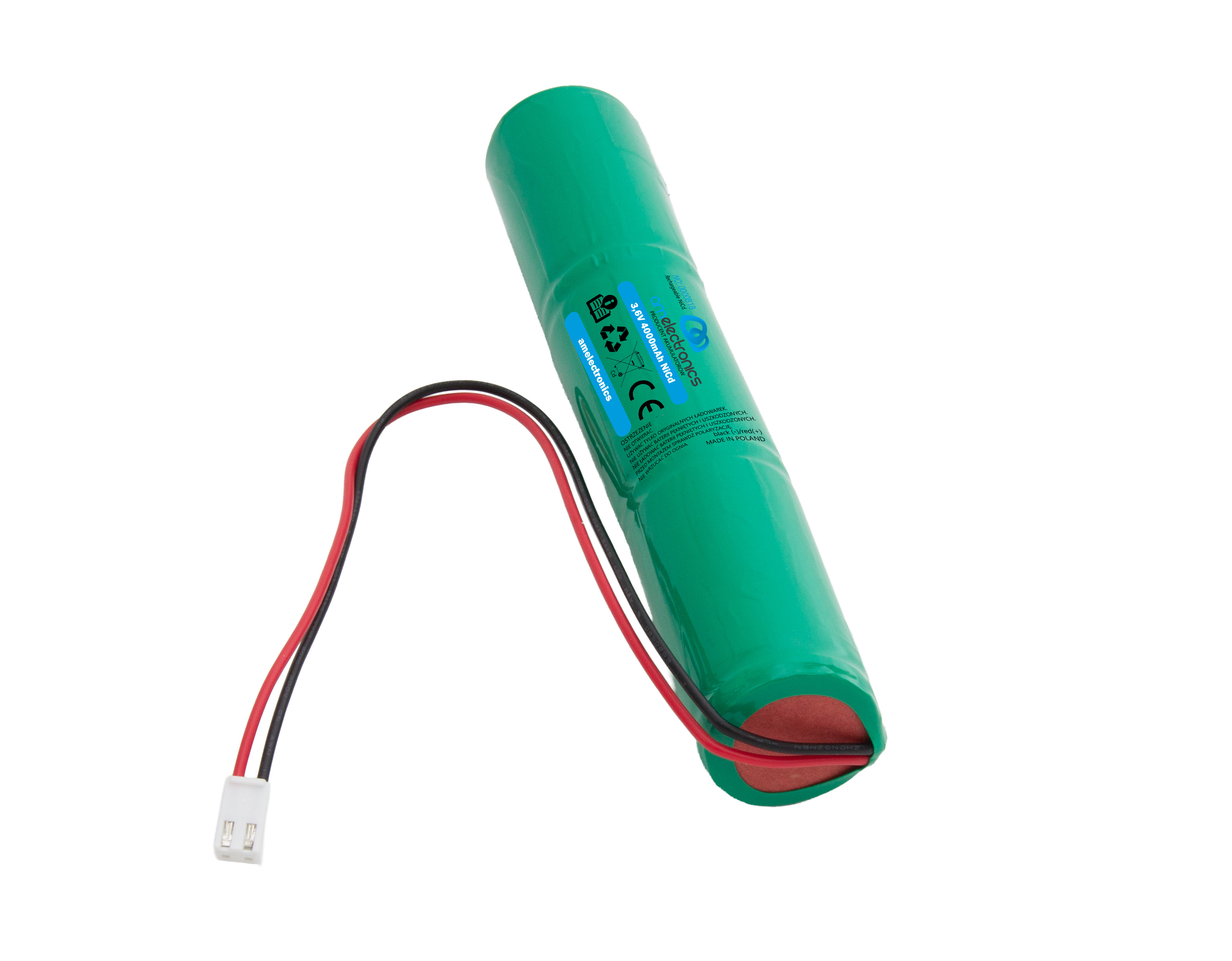 Akumulator do lampy awaryjnej 3,6V 4000mAh Ni-CdWysokiej jakości pakiet akumulatorów Ni-Cd o pojemności 4000mAh i napięciu 3,6V, przeznaczony do zasilania lamp awaryjnych, opraw ewakuacyjnych oraz innych urządzeń wymagających niezawodnego zasilania rezerwowego.Specyfikacja techniczna:Napięcie: 3,6VPojemność: 4000mAhTyp ogniw: Ni-Cd (niklowo-kadmowe)Konfiguracja: 3 ogniwa SC połączone szeregowoZłącze: Wtyk 2-pinowy (pasuje do większości opraw)Przewody: Czerwony (+), Czarny (–)Stan: Fabrycznie nowyZastosowanie:Lampy awaryjne i oprawy ewakuacyjneSystemy oświetlenia bezpieczeństwaUrządzenia zasilane pakietami 3,6V Ni-CdJako zamiennik zużytych pakietów w starszych systemachCechy produktu:Duża pojemność – dłuższy czas świecenia lamp awaryjnychSprawdzone, niezawodne ogniwa Ni-CdGotowy do użycia – wyposażony we wtyk i przewodyKompatybilność z szeroką gamą urządzeńUwaga!Nie ładować uszkodzonych lub przegrzanych pakietówNie wrzucać do ogniaZalecane stosowanie oryginalnych ładowarekProdukt zawiera kadm – utylizować zgodnie z przepisami