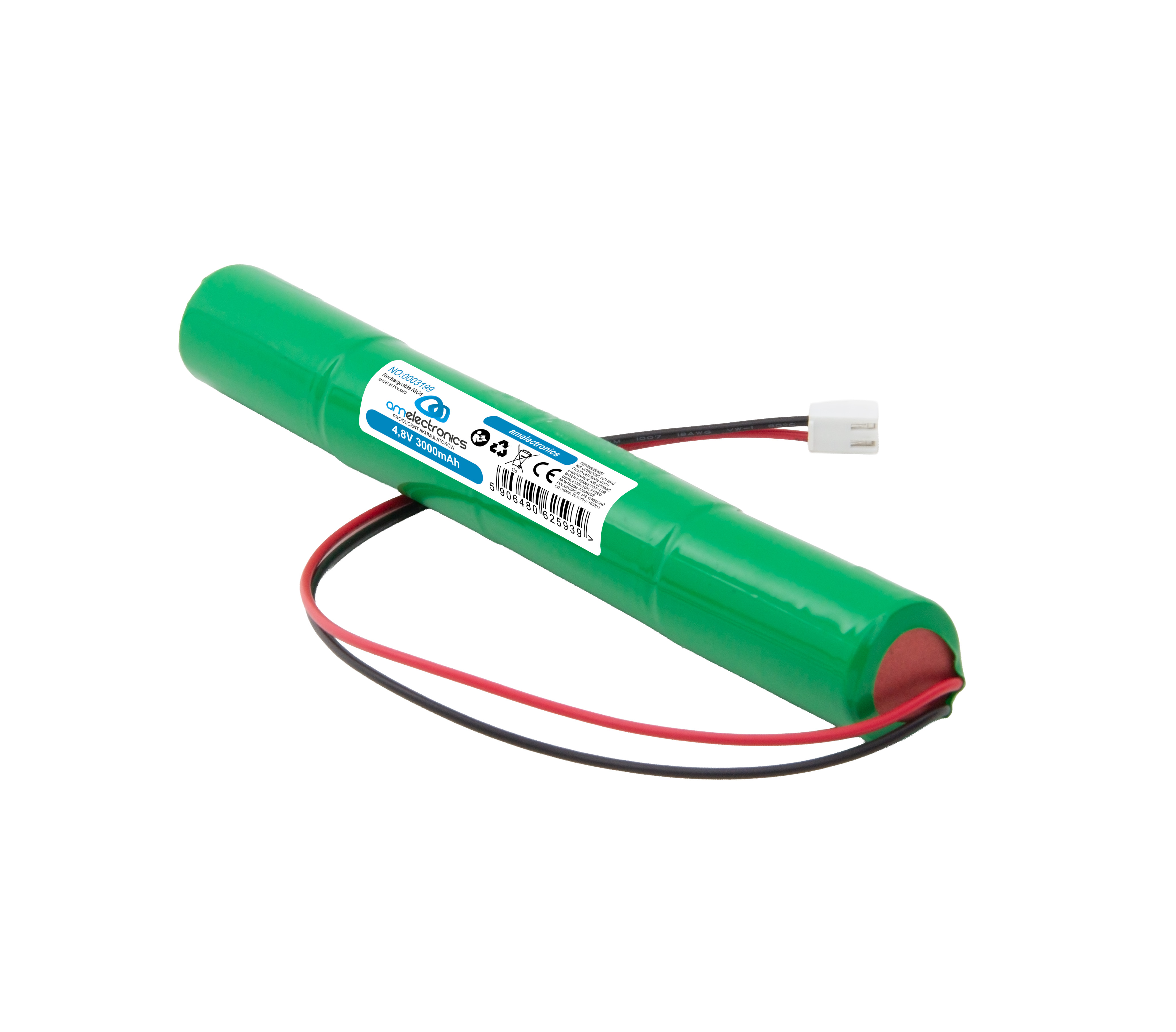 Akumulator do lamp awaryjnych Ni-Cd 4,8V 3000mAhNowy akumulator Ni-Cd 4,8V / 3000mAh przeznaczony do lamp awaryjnych oraz oświetlenia ewakuacyjnego. Wyposażony w przewody z wtyczką 2-pin, co umożliwia szybki i prosty montaż. Idealny do opraw LED, gdzie wymagana jest długa autonomia świecenia.Specyfikacja:Chemia: Ni-Cd (niklowo-kadmowy)Napięcie nominalne: 4,8VPojemność: 3000mAhZłącze: 2-pin (JST-VHR-2P)Do pracy buforowej i cyklicznejCertyfikaty: CE / RoHSZastosowanie:lampy awaryjne LEDoświetlenie ewakuacyjneoprawy bezpieczeństwamoduły podtrzymujące oświetlenieZalety:bardzo długi czas podtrzymania pracy oprawyodporność na podwyższoną temperaturęmożliwość stałego doładowywania (stand-by)niezawodna technologia do zastosowań awaryjnych